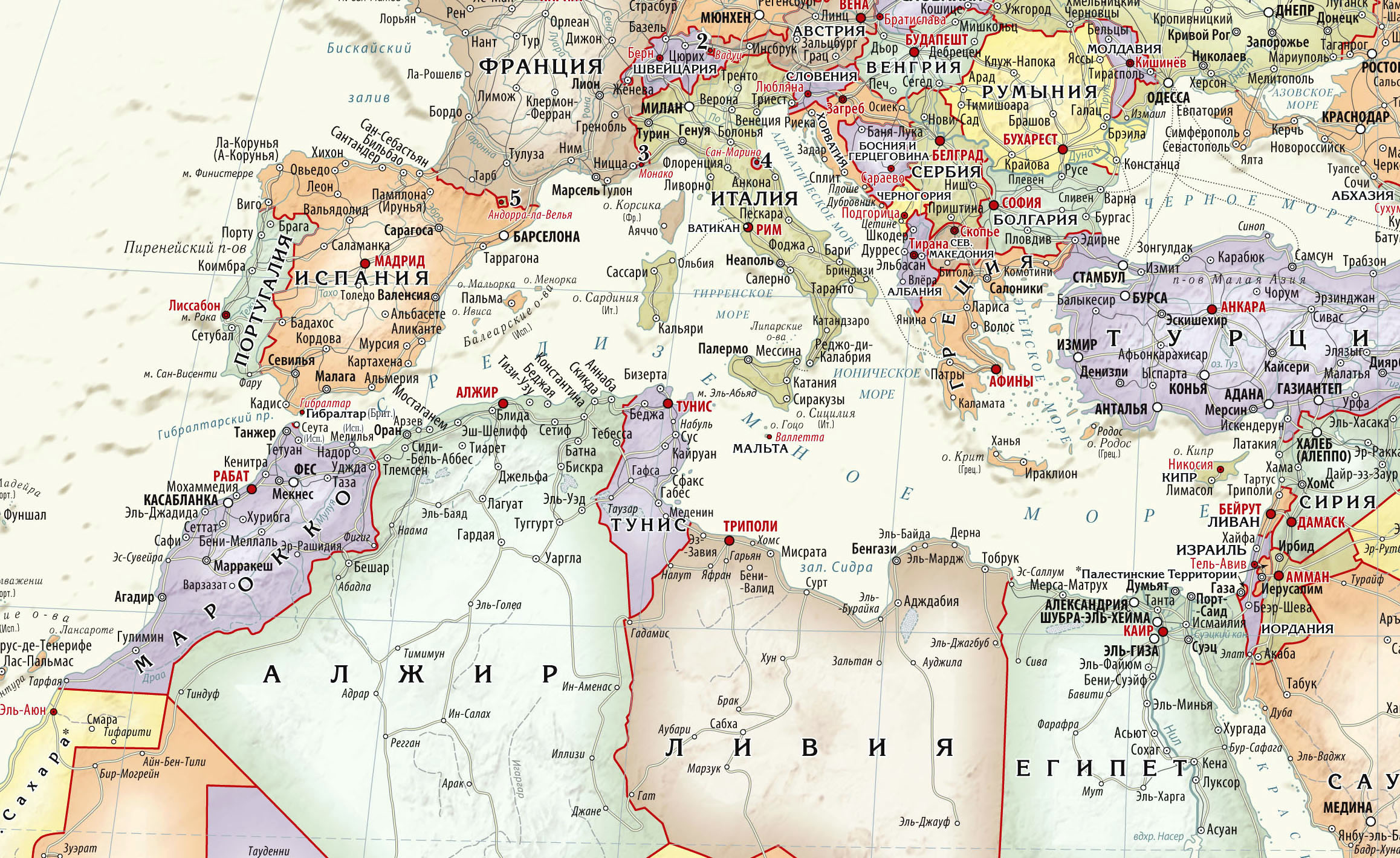 На карте показаны: все страны мира, подписаны названия столиц, основные населенные пункты.