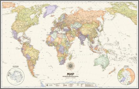 Политическая карта мира в английском стиле является замечательным образцом картографического искусства. Её особые черты - океаны цвета слоновой кости, яркие краски, черная строгая окантовка в сочетании с очень подробной географической информацией делают карту неповторимой.