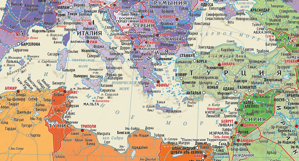 На карте показаны: все страны мира, подписаны названия столиц, основные населенные пункты.
