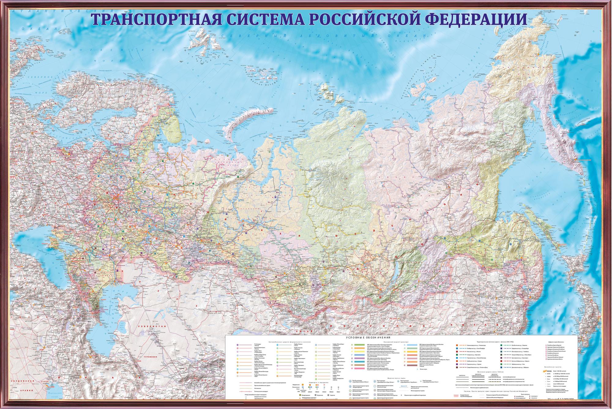 Рельефная карта "Транспортная система Российской Федерации" политико-административная 3D рельеф (1,95 х 1,3)