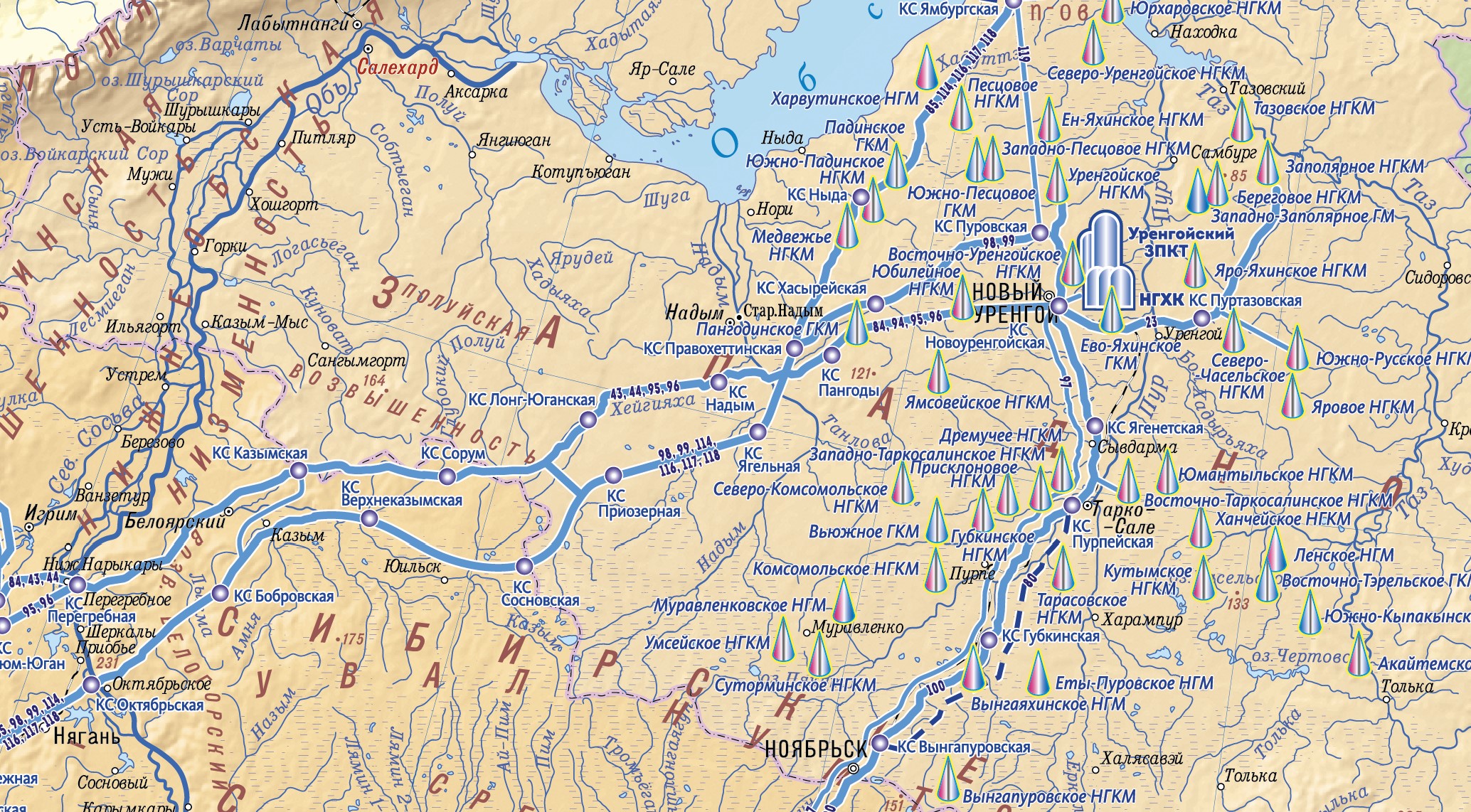 Содержание карты включает: месторождения газа, систему магистральных и прочих газопроводов, процессинговые заводы и их названия, подземные хранилища газа, компрессорные станции и другая информация.