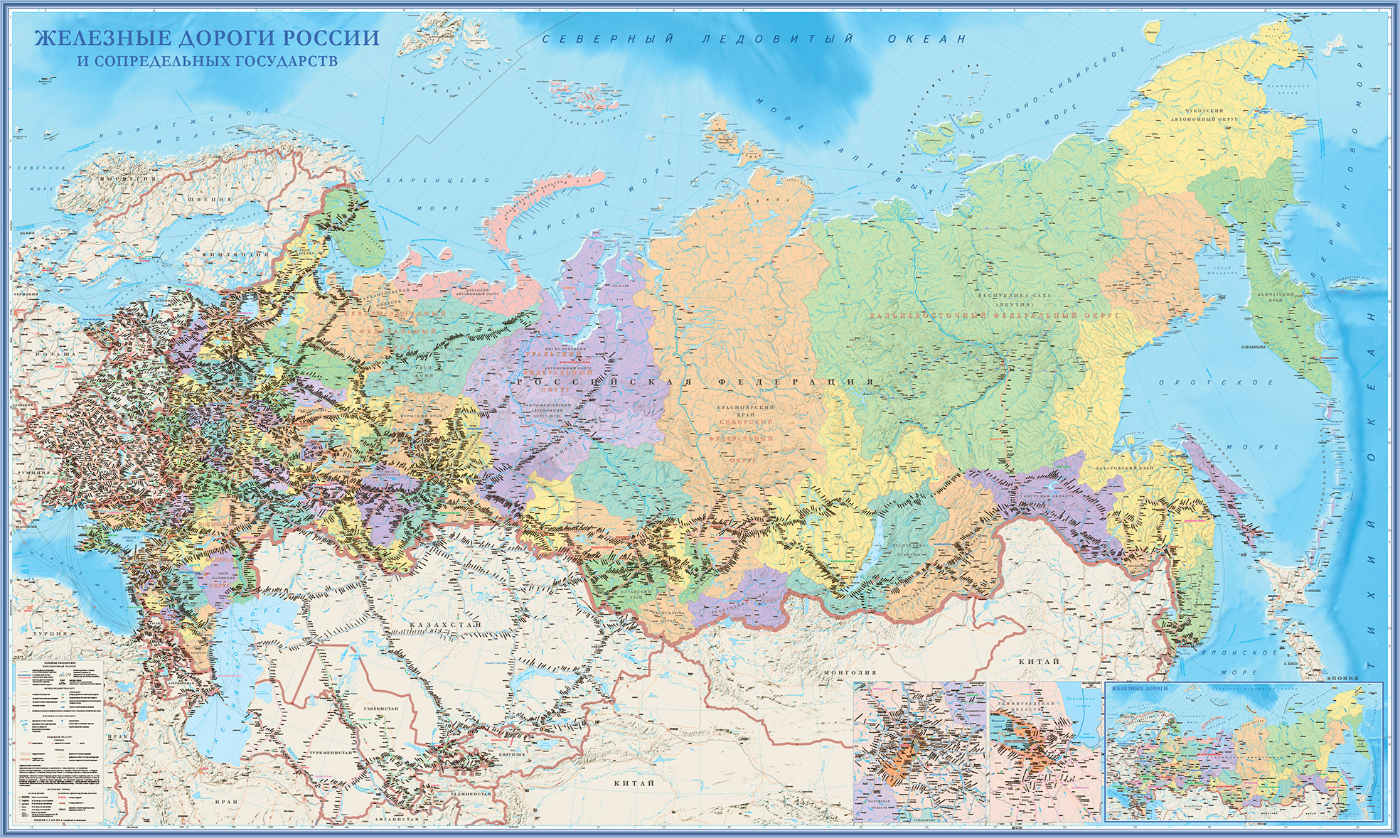 Подробно на врезках даны железнодорожные узлы Москвы, Санкт-Петербурга, врезка с делением железных дорог РФ. Кроме того, на карте показаны прочие пути сообщения (главные автодороги, судоходные каналы, морские и речные порты) и политико-административное деление России.
