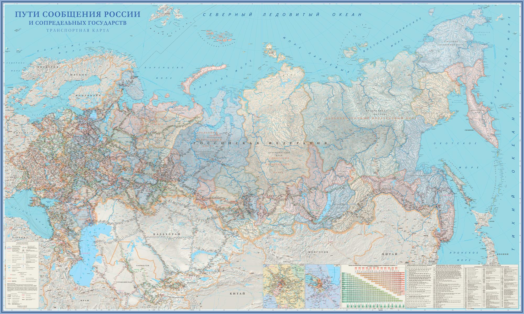 Единая транспортная карта, включающая все основные виды транспорта России и сопредельных государств. На карте дана детальная информация по транспортной инфраструктуре России и сопредельных государств. На карте показано политико-административное деление России.Информация дана на 2024 год.
