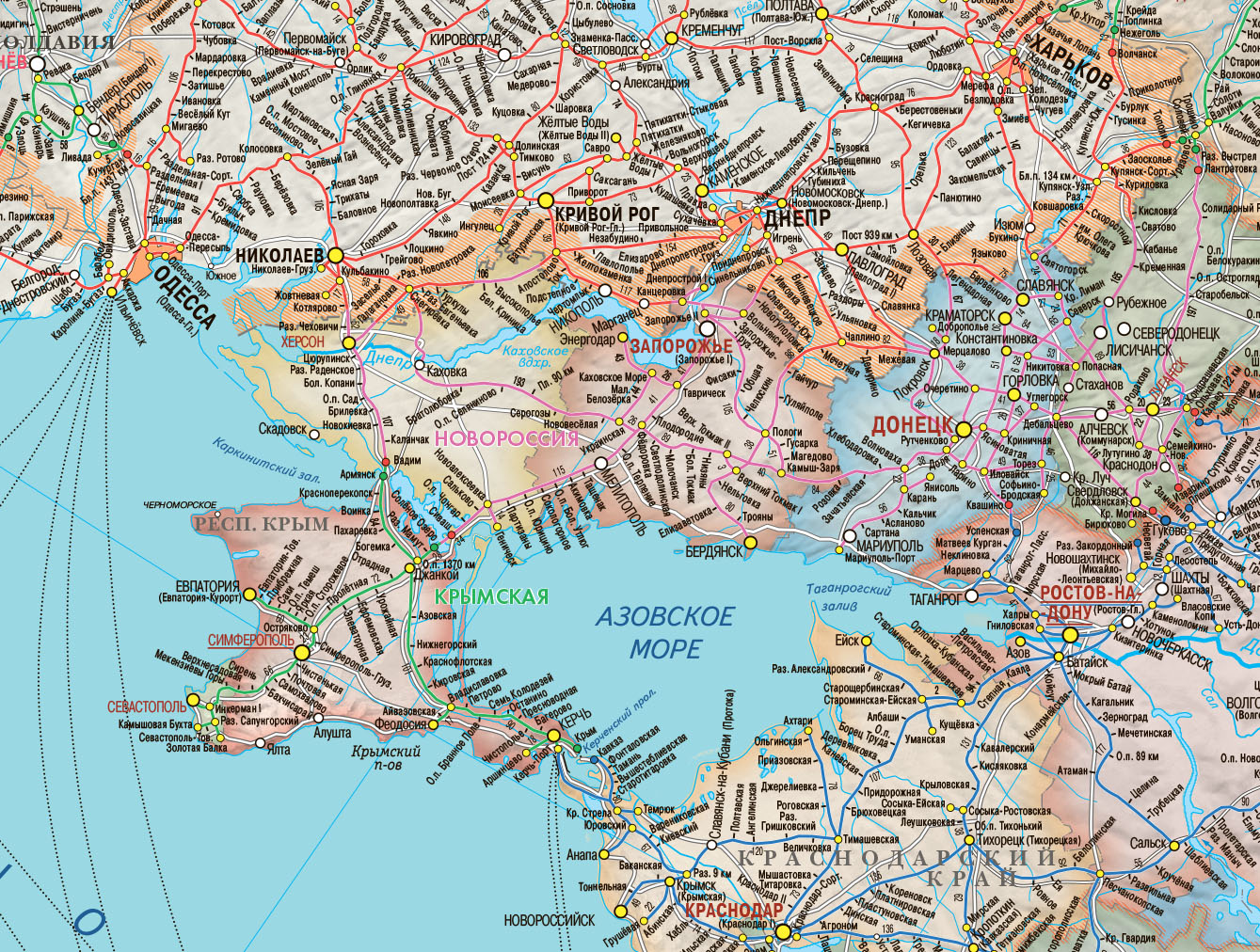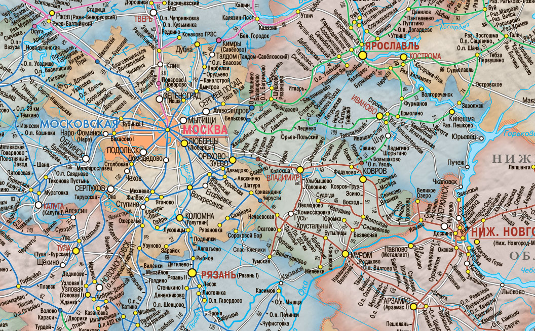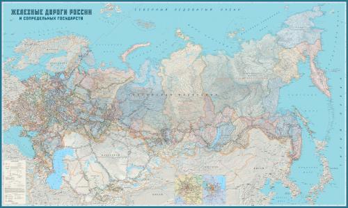 Подробно на врезках даны железнодорожные узлы Москвы, Санкт-Петербурга. Кроме того, на карте показаны прочие пути сообщения (главные автодороги, судоходные каналы, морские и речные порты) и политико-административное деление России.