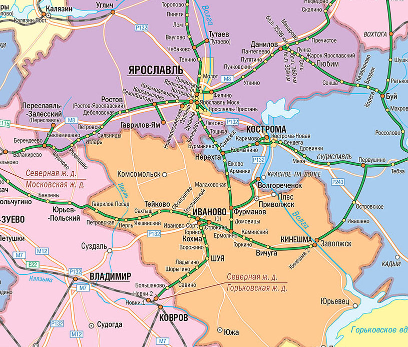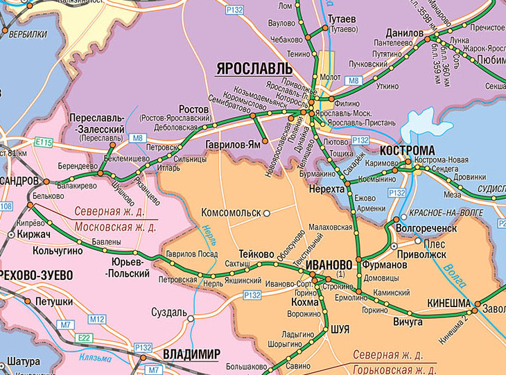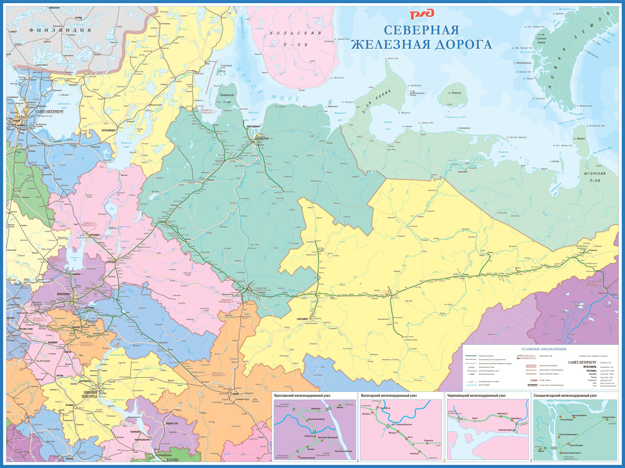 На карте показаны все станции Северной железной дороги и узловые станции сопредельных железных дорог.